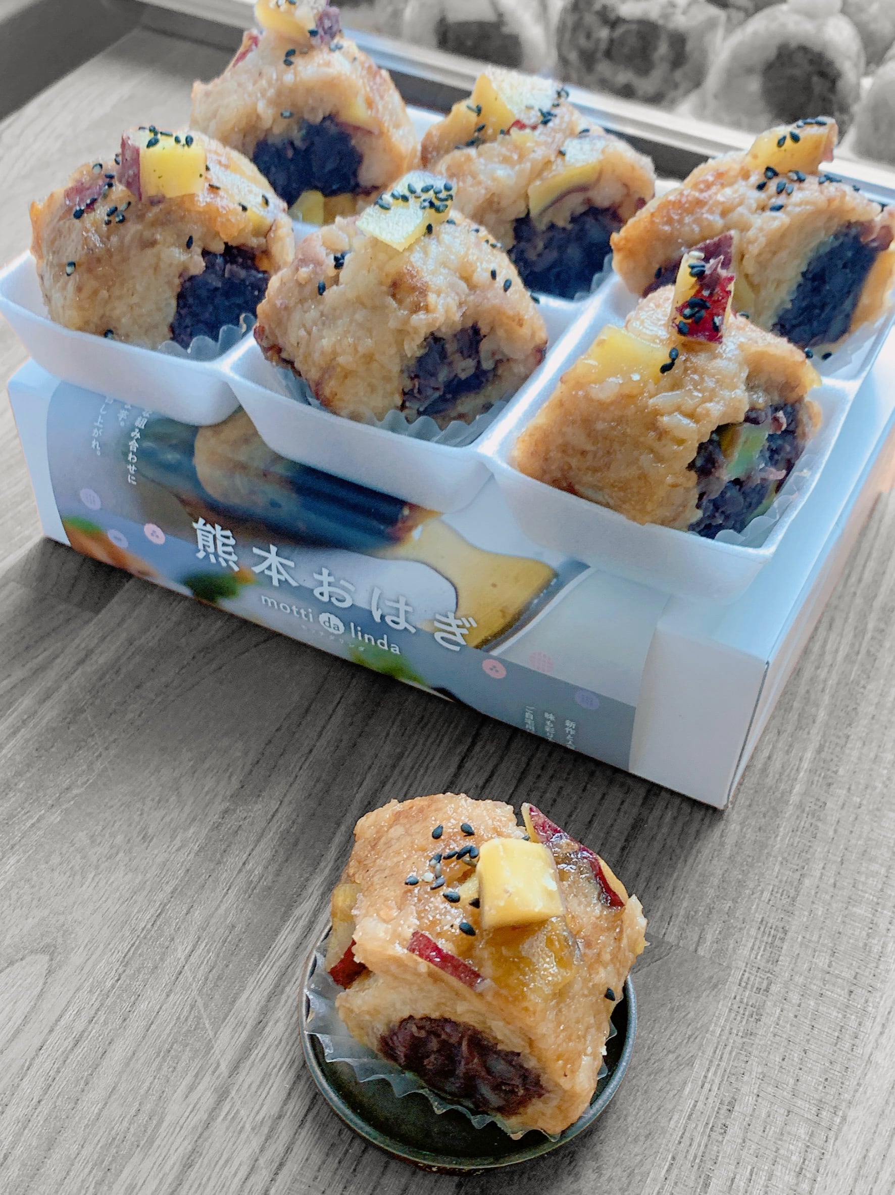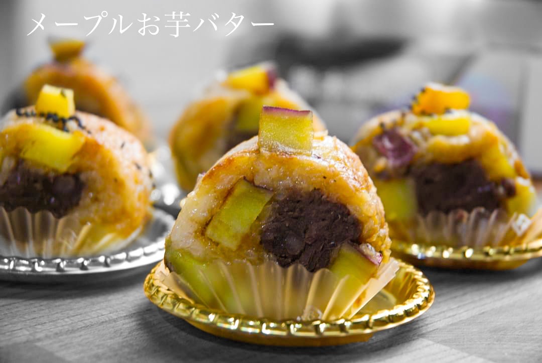 バター米に地元熊本の大津産の唐芋バターで炒めさらにメープルシロップを絡ませ、粒あんを巻いたバタ餅 メープルシロップを掛けてお食べ下さい